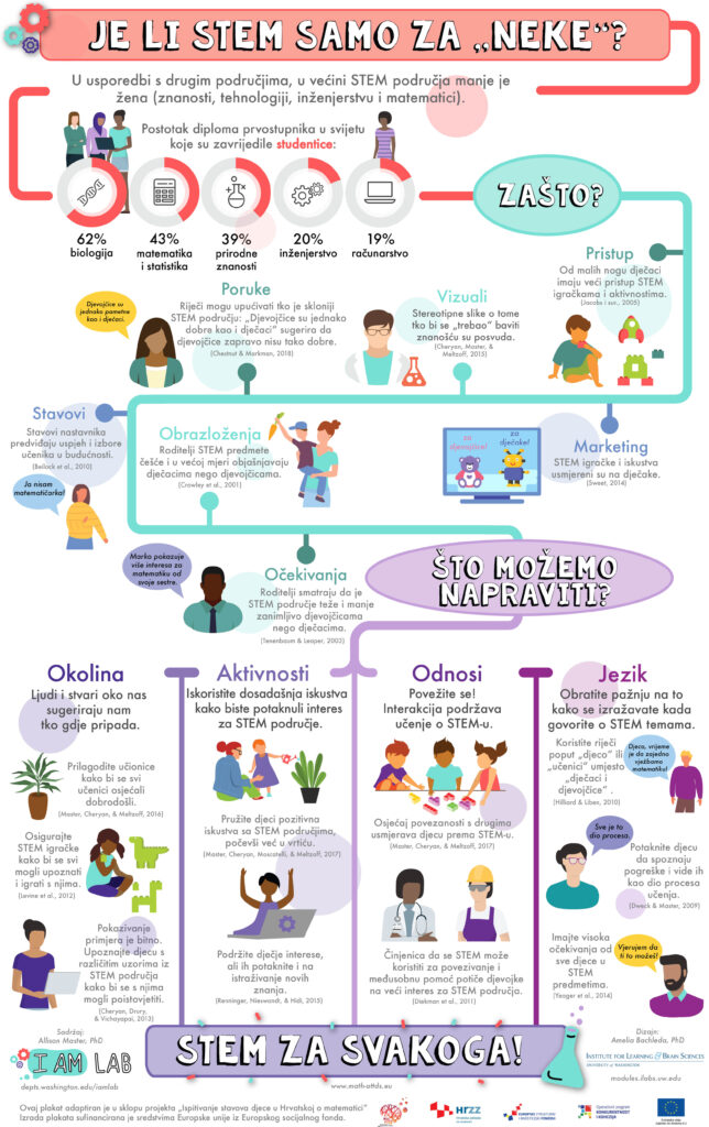Postoji veliki jaz između djevojčica i dječaka kod angažiranja u znanosti, tehnologiji, inženjerstvu i matematici (STEM). Rodne razlike počinju se javljati vrlo rano te se može zaključiti kako u osnovnoj školi djevojčice imaju manji interes za tehnologiju u usporedbi s dječacima. Djeca već u prvom razredu razvijaju stereotipe o tome da su dječaci bolji od djevojčica u robotici i programiranju, a sukladno tome djevojčice imaju manje interesa za ta područja. Pogledajte našu infografiku i usvojite neke metode za približavanje STEM područja svoj djeci, jer „Stem je za svakoga“